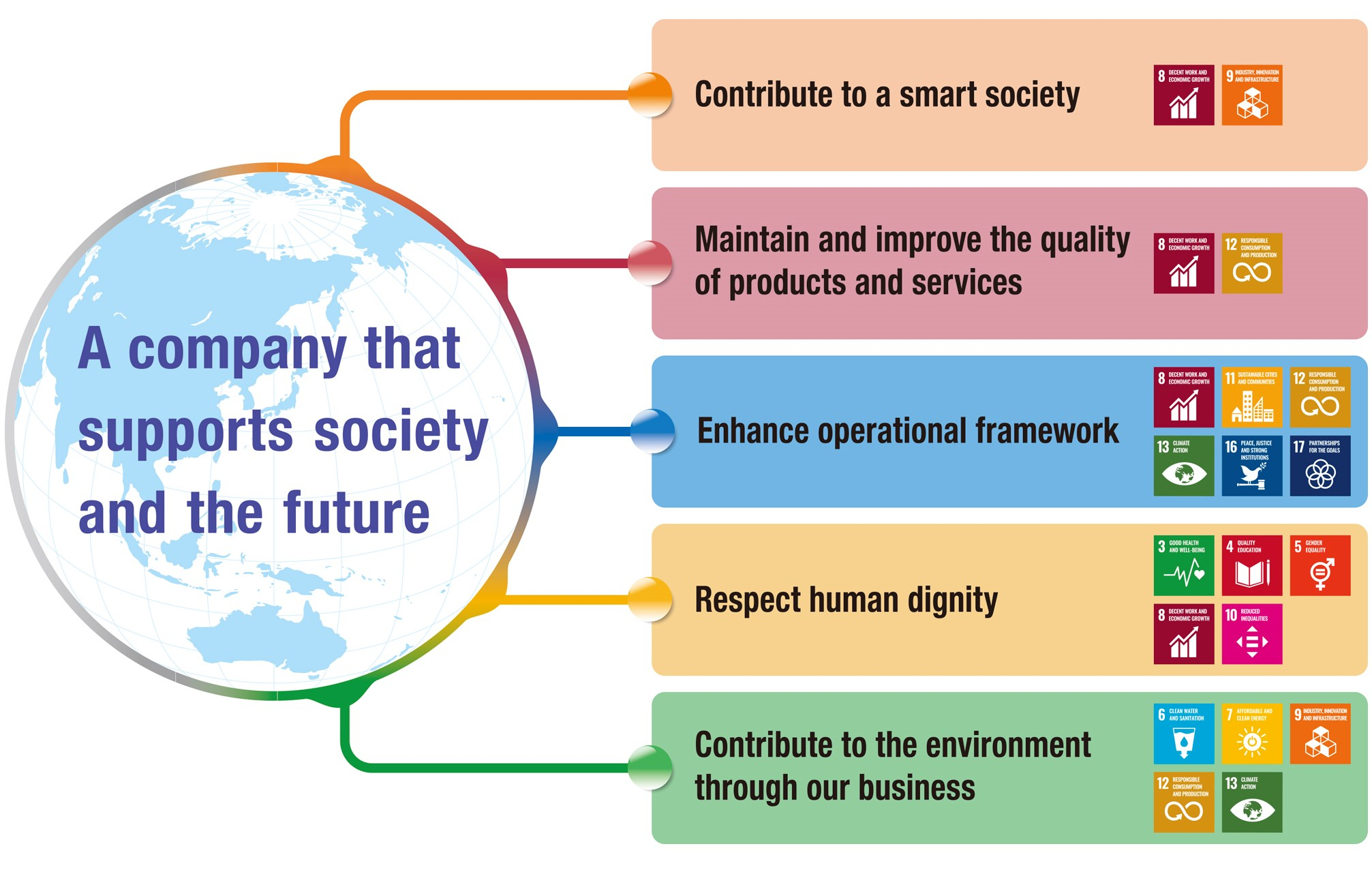 Kawada: We have positioned our three-year business plan Value Transformation 2023 and our Sustainability Action Plan as the two pillars of our management strategy and will contribute to achieving the SDGs through their implementation. The Sustainability Action Plan consists of five themes and 18 materialities (important issues): "contribute to a smart society," "maintain and improve the quality of products and services," "enhance operational framework," "respect human dignity," and "contribute to the environment through business.”