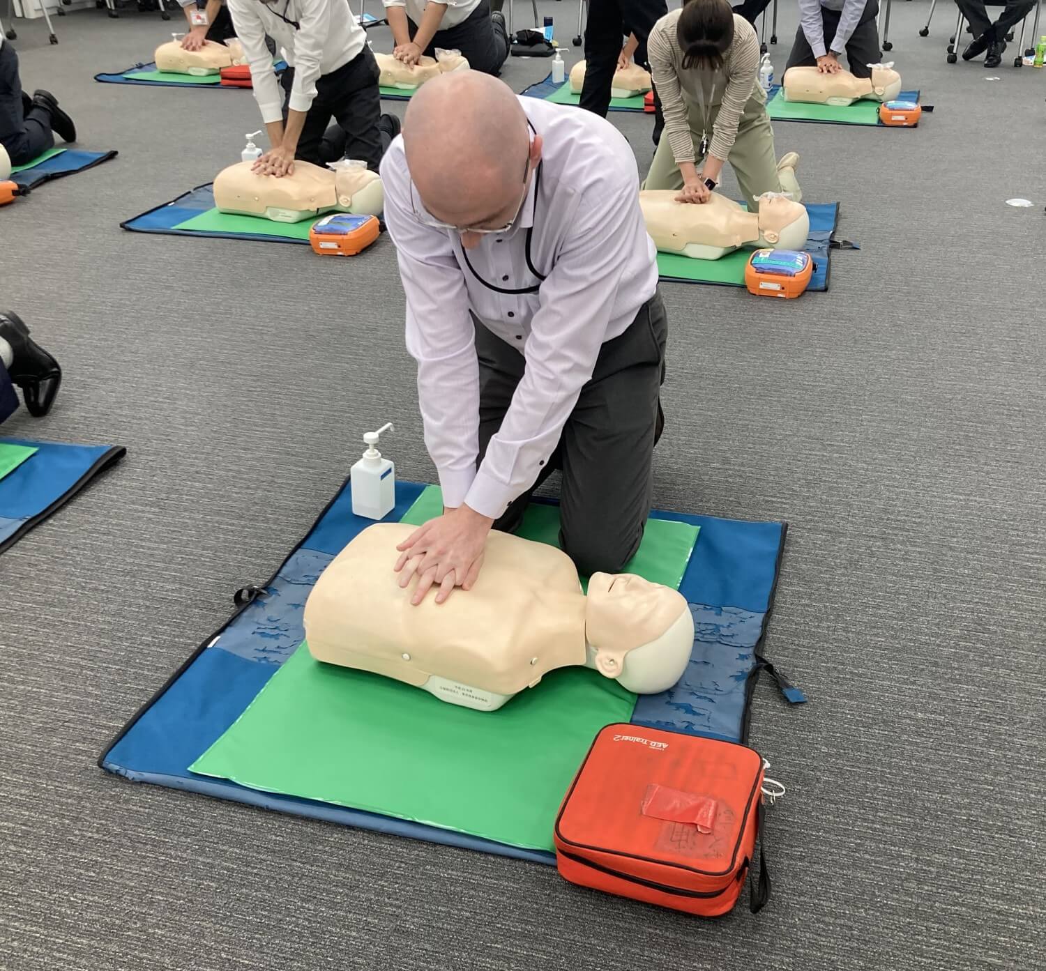 Shoubu: Here at the Tokyo Head Office, we hold this emergency first aid course every year. Under the guidance of the local fire department, we place particular focus on CPR (cardiopulmonary resuscitation) and how to use an AED (automated external defibrillator). Employees looking for a first aid refresh are always welcome, but we're also really encouraging people who haven't taken part yet to join - the goal is to increase the number of people who can help those at the scene of an emergency wherever they may be.