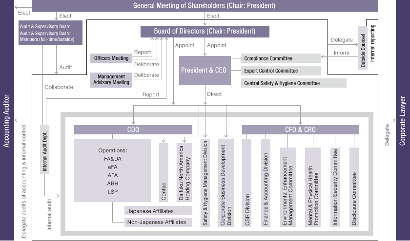 Daifuku develops systems mainly for its internal control, compliance, and risk management with the aim of raising the effectiveness of corporate governance as well as corporate trustworthiness and operational efficiency.