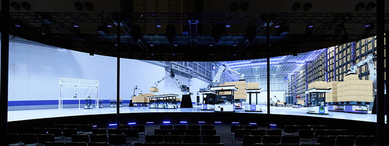 At the Daifuku booth, a 10-minute presentation, featuring the combination of a live speaker and a 3D video showcasing Daifuku’s vision for future automation solutions displayed on a 22-meter-wide, 3.6-meter-tall screen equipped with the latest 3D LED system.
