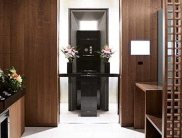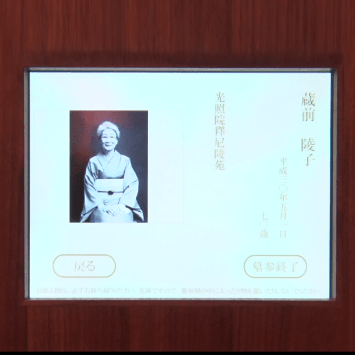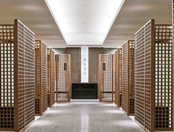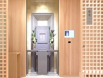 The main hall of Shinkyoji temple was originally a tiled roof building. However, due to the Great East Japan Earthquake of 2011, the building was tilted and had to be rebuilt. In Ocrober 2017, the Kuramae Ryoen equipped with the automated columbarium was completed. In response to the wishes of the chief priest to "create a place where everyone can feel the meaning of their birth and the joy of life", it is open to all denominations of Buddism. Kuramae Ryoen was designed to be a building filled with light so that the precious "light of life" can be passed on to future generations. The interior has a chic and modern design using natural materials such as stone, wood and plaster, and is a peaceful space suitable for memorializing a loved one.