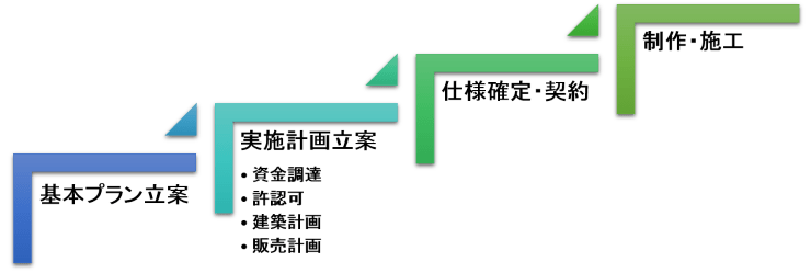用地の開発・検討、資金調達、販売計画、建築基準法・許可などの調査、事業計画、設計、建設、施工、アフターサービスまで経験豊富な専任スタッフがトータルにご提案します。