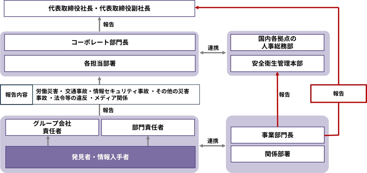 また、災害や事故が発生した際にも速やかな経営判断が行えるよう、「災害・事故発生時の報告ルート」を作成し、毎年見直しを行っています。