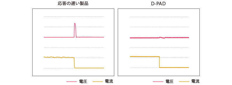 また応答速度が速いため、リチウムイオン電池のように、バッテリー自身が充電中に突然切断するような場合でも、電圧の跳ねなどは無く周辺機器を損傷させる心配はありません。