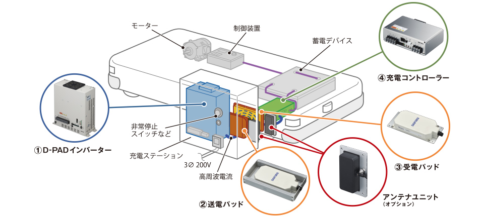充電ステーション停止時に、「①D-PADインバーター」から高周波電流を「②送電パッド」に流し、電磁誘導作用で「③受電パッド」に電力を受け渡します。その電力を「④充電コントローラー」でバッテリーやキャパシタなどの蓄電デバイスへ充電します。アンテナユニット(オプション)は①D-PADインバーターと④充電コントローラーに接続することで、充電可能な範囲内に送受電パッドが近づくと自動で充電を開始することができます。またI/Oケーブルを利用した制御も可能です。