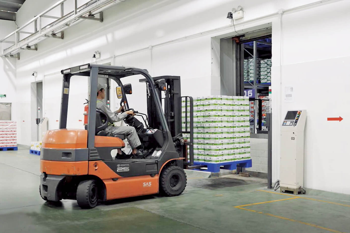 Products transported from the factory by conveyor are palletized by SKUs and put into the automated warehouse by forklift. Later, the products are sent to the order picking area where they are mix-palletized according to shipping orders of the next day and then store back into AS/RS. On the next day, the products are retrieved to the shipping area in time for the arrival of the shipping trucks so that they are shipped in a short time, maintaining low temperatures.