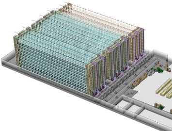 The AS/RS in the frozen area, with five double-deep-type S/R machines. The AS/RS in the chilled room has three single-deep-type S/R machines.