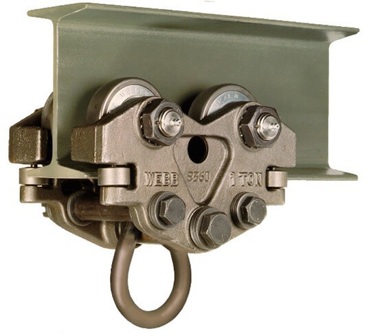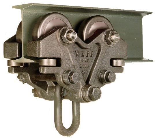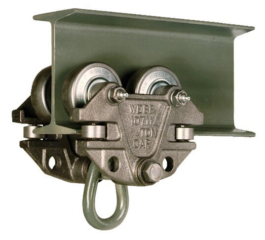 Our patented side roller is standard on all hand-pushed trolleys and keeps the trolley running smoothly and prevents the brackets from rubbing on the flange of the I beam around curves.