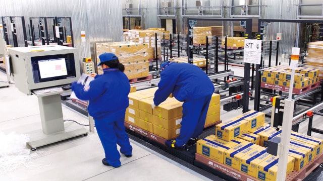 A品を保管し、ピッキグステーションでトータルピッキングを行い、仕分けラインに投入します。