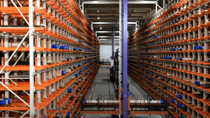 最も一般的な自動倉庫の構成。1台のスタッカークレーンが、左右1列、合計2列の棚にアクセスします。 -