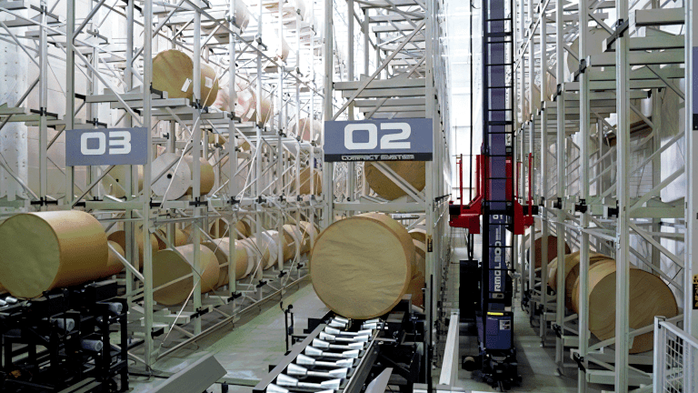 - 原材料や金型を保管し、無人搬送車で各生産ラインへ自動供給。