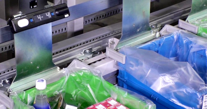デジタル表示器の指示に従い商品を摘み取っていく、高精度ピッキングシステム。