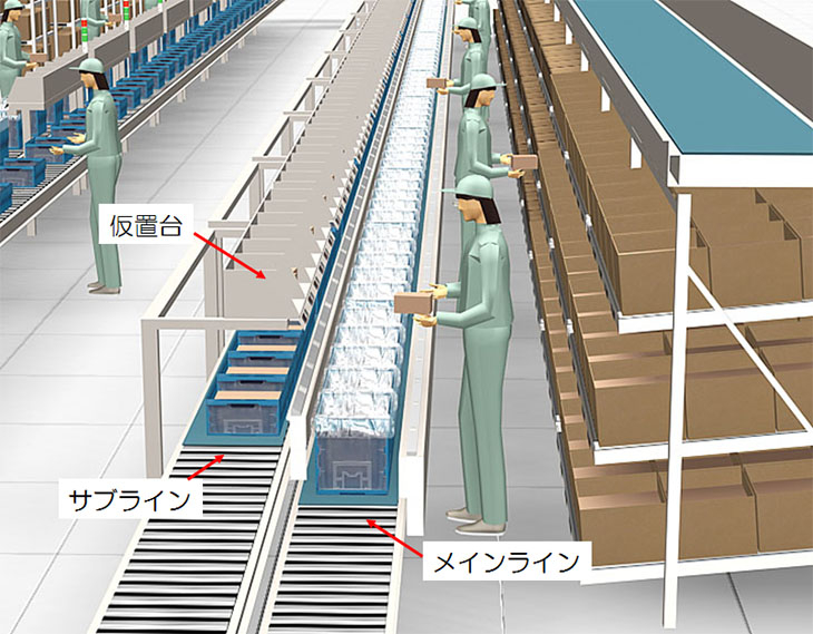 集品コンベヤを、メインとサブの2列配置。単行オーダーをサブラインで、複行オーダーをメインラインで集品することで、メインラインのゾーンヒット率を向上させます。また、作業者の手待ち時間を利用し、仮置き台に先行ピックしておくことで、更なる効率化をはかります。