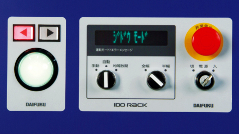 大型ボタンは、フォークリフトに乗ったままでも、スムーズに操作できます。操作パネルには、運転モード切替スイッチ、非常停止ボタン、運転モードやエラー内容を表示するディスプレイを搭載しています。