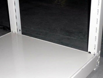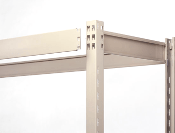 棚受けと棚板はフラットな形状。長尺物など多様な荷姿にも対応できます。各棚板の高さは50㎜ピッチで調整可能です。