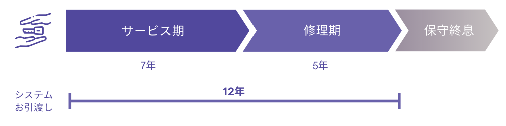 制御関係の電子部品は技術革新に追従して数年で生産中止となり、修理・交換も難しくなります。一般的には、設備の償却年数をもとに最長12年と設定されています。当社では社内製作する制御モジュールについては、納入後7年のサービス期間(受注生産可能)、さらに5年の修理対応期間を合計した12年を保守可能期間と考えています。