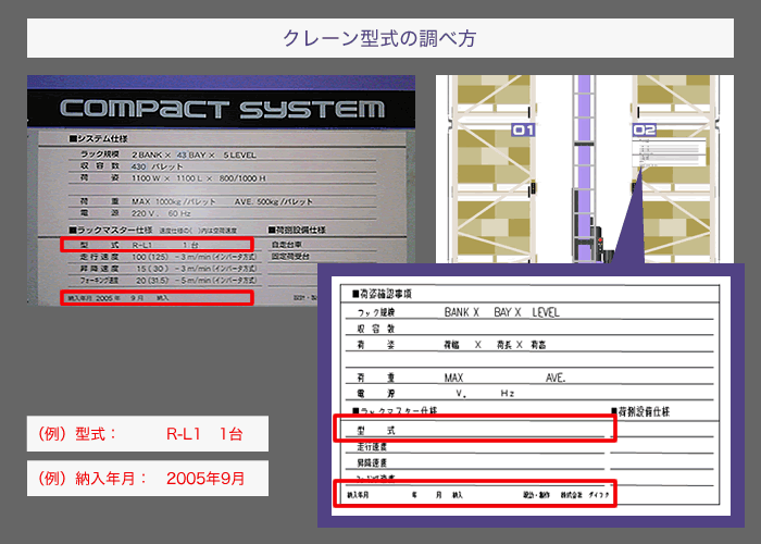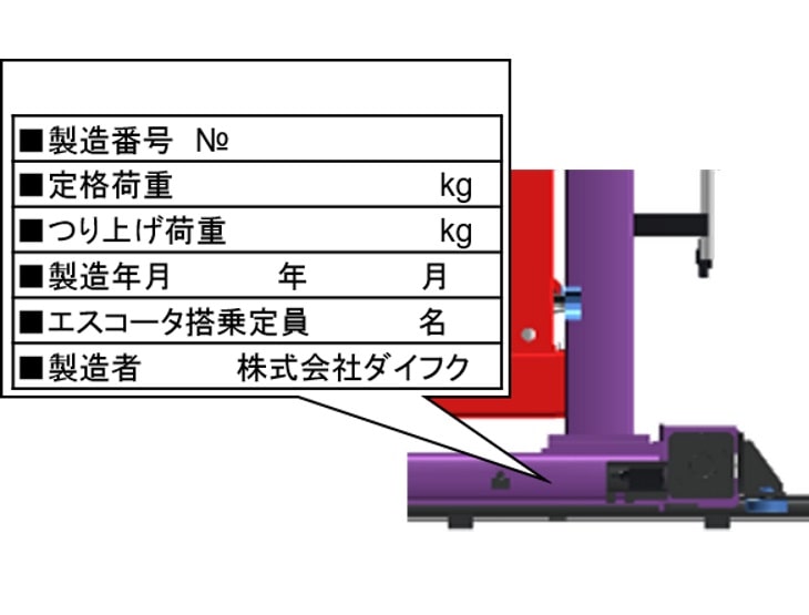 吊上荷重は、納入時にお渡しする図面集もしくはスタッカークレーン下部フレーム側面の製造番号銘板でご確認ください。