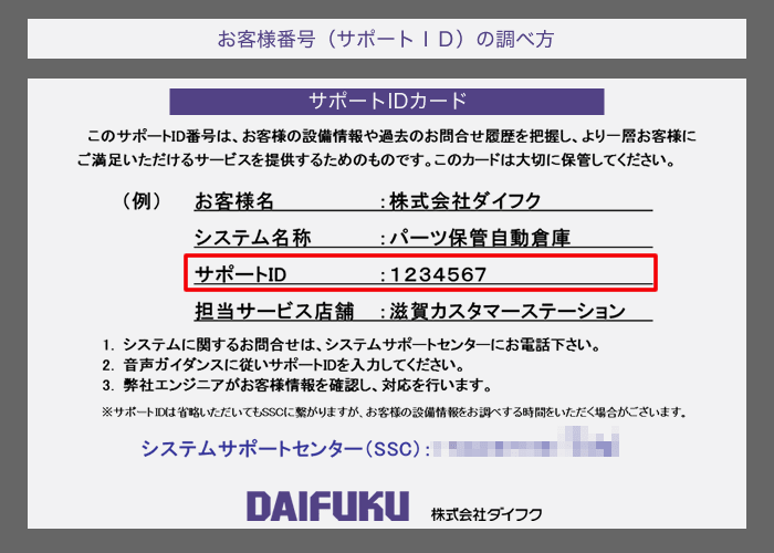 システム納入時にお渡しするサポートIDカードに記載されています。