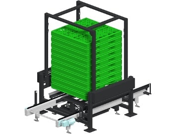 1. The pallet dispensing machine dispenses empty pallets one at a time onto a conveyer.
