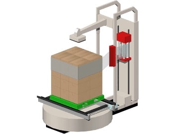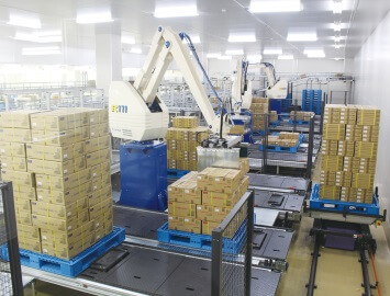 Products that are finished and boxed are loaded onto an empty pallet which is then shrink-wrapped and stored. When an order arrives, the pallet is removed and products are loaded into trucks. If done manually, these processes demand a large amount of manpower.