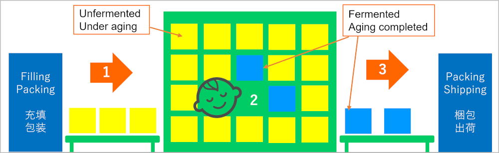 In addition, for certain products it is necessary to let them rest at controlled temperatures and humidity. For example, fermenting yogurt or aging chocolate. By using an AS/RS for these processes, it becomes possible to automatically have individual containers or pallets rest at a certain temperature for predetermined amounts of time. Due to it being unnecessary for personnel or forklifts to enter and exit the area, it is much easier to maintain the necessary storage environment. In addition to food processing, this system can be used in a wide variety of fields such as to maintain freshness of produce, preserve seafood, or in the production of reusable batteries.