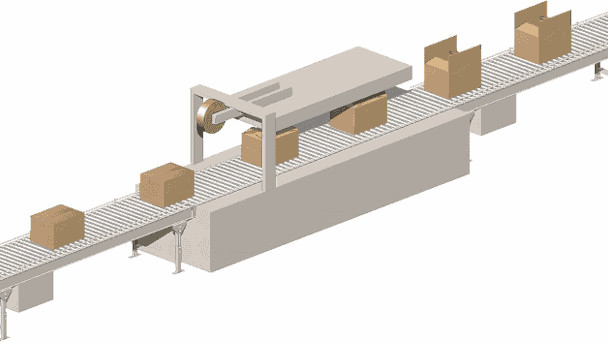 The sealing machine automatically closes the lid of the box and fixes it in place with tape. A version that can automatically adjust the height of the corrugated boxes according to the height of the contents is also available.