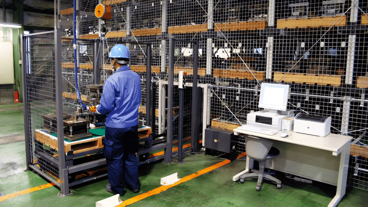 A specially designed, highly accurate stacker crane facilitates 24-hour automatic supply and collection of jigs to and from machining centers. The system incorporates specialized features to ensure precise and stable AS/RS operations in oily and dusty environments.