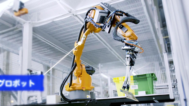 A Shuttle Rack M feeds inventory totes to a piece picking robot to transfer items into order collection totes.