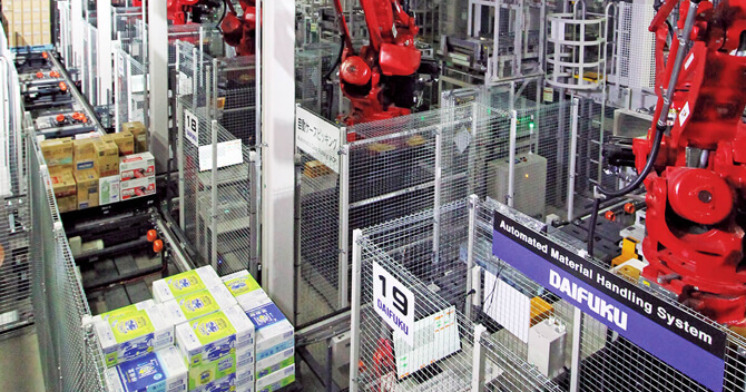 - Buffering products from manufacturing lines and feeding to palletizing robots by product group