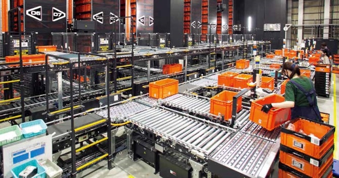 A Quick Pick Station smoothly provides an inventory tote supplied from Shuttle Rack M and a pick-to tote together in front of a picking operator, eliminating walking time and fatigue.