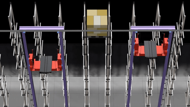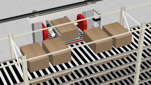 The most common type is called the stacker crane. The stacker crane, anywhere from 5 to 40 meters high, runs back and forth on a lower rail fixed to the floor and an upper rail attached to the top of the rack, while simultaneously lifting and lowering the carriage section that carries the load. Upon arrival at the desired rack bay, a fork on the carriage is inserted into the bay to scoop up or unload the item.
