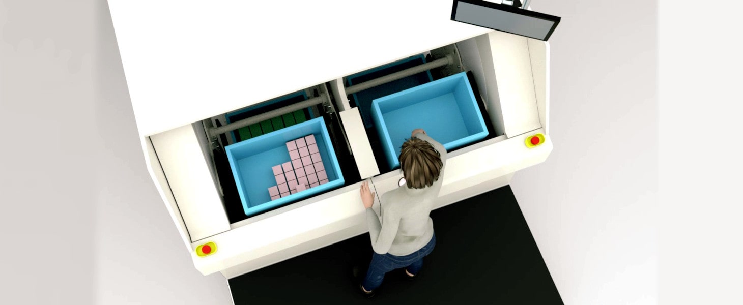 Both the inventory container and the order collection container are automatically supplied to the operator. The operator just follows the instructions on the display and picks the required quantity. Since both containers are supplied at a time, there is no chance of placing the picked items into an wrong collection container.