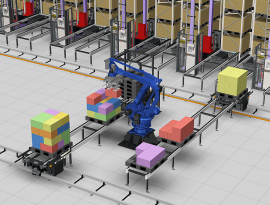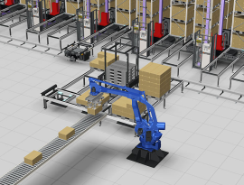 The robot picks products from inventory pallets and palletize onto a shipping pallet to make an order pallet. If the stacking order on the pallet is specified, the inventory pallets are fed from the automated warehouse to the robot position in the specified sequence. The optimal stacking pattern is calculated by the simulator, making it possible to create stable shipping forms.