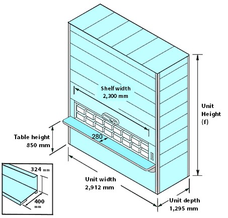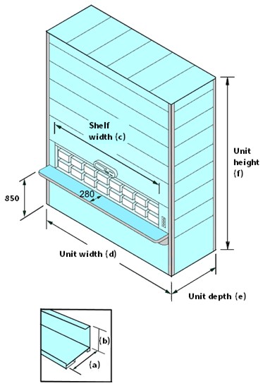 | Shelf length (c) | 1,800 / 2,300 / 3,000 millimeters (pick window height is 580 mm) |