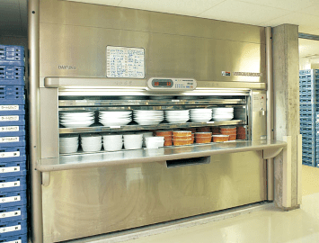 When storing items that require a clean environment, such as tableware, medical instruments, and sterilized containers, the carousel's main body panels, shelves, and tables can be made of stainless steel, which is well suited to such conditions. Also, the system can be equipped with a sterilization light to prevent the growth of bacteria on stored items that have already been cleaned, disinfected, and sterilized - it cannot sterilize or disinfect items that are entered into the system unclean.