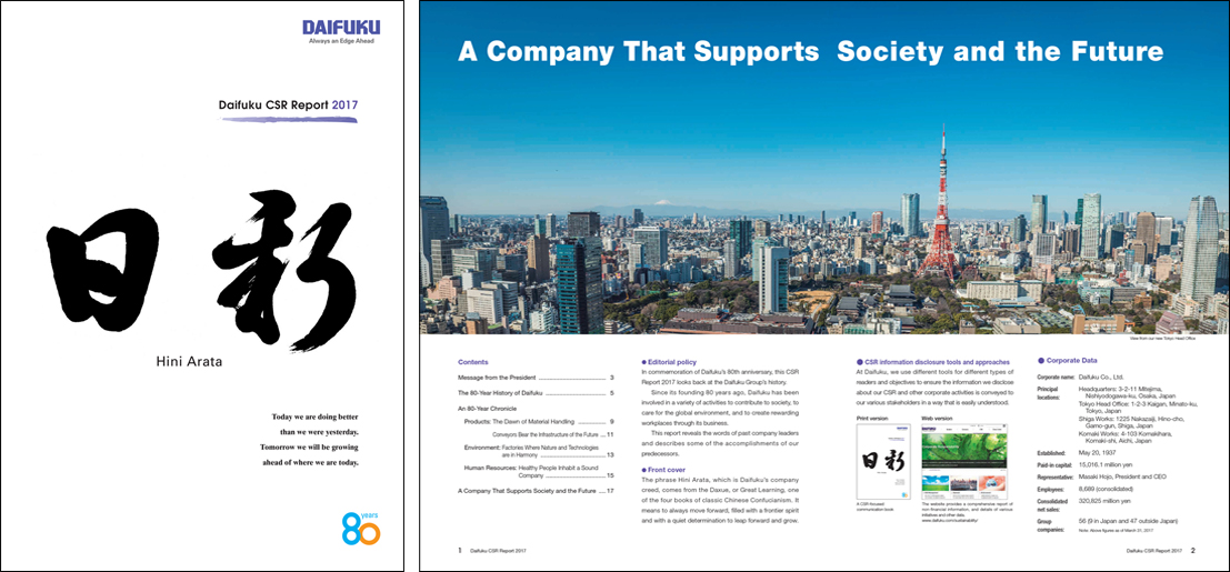 Daifuku Co., Ltd has made available its corporate social responsibility (CSR) Report 2017. In commemoration of Daifuku’s 80th anniversary, this CSR Report 2017 looks back at the Daifuku Group’s history. Since its founding 80 years ago, Daifuku has been involved in a variety of activities to contribute to society, to care for the global environment, and to create rewarding workplaces through its business. This report reveals the words of past company leaders and describes some of the accomplishments of our predecessors.