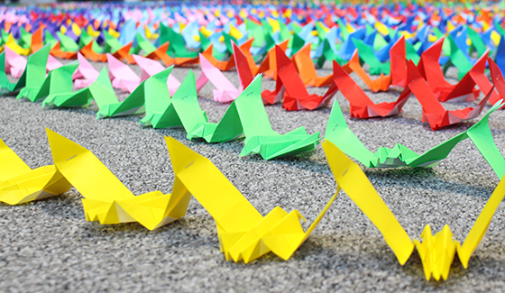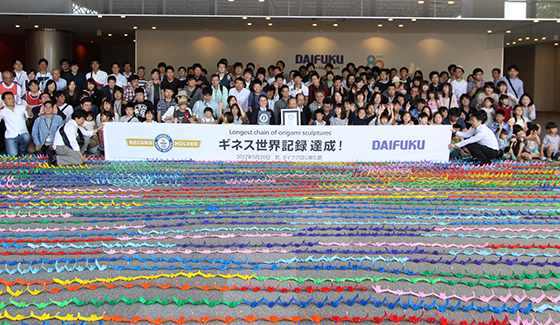Osaka, Japan- On Saturday, May 20, celebrating its 80th year anniversary, Daifuku Co., Ltd. gathered Group employees and their families, for a total of 235 people, at Hini Arata Kan, the exhibition center in the Shiga Works, to attempt the Guinness World Record for the “Longest chain of origami sculptures.” Beating the previous record of 2,855 sculptures, a new world record was set with a chain of 5,510 sculptures.