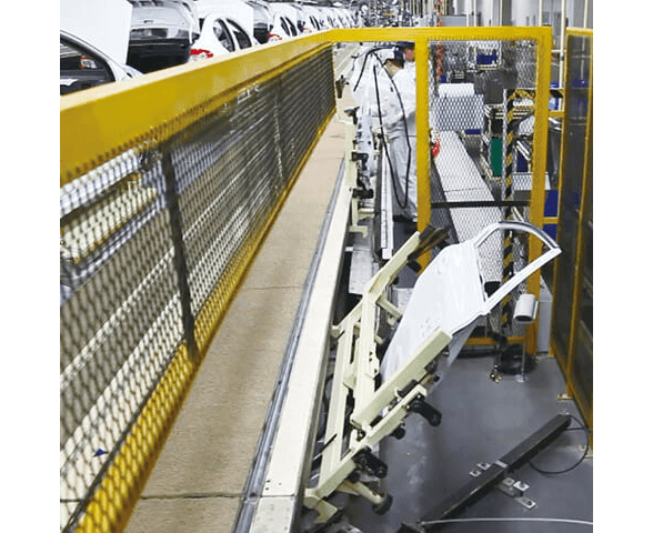The FALS adopted for the assembly line can raise and lower the vehicle body to a height that is comfortable for workers in each process, which is a function that conventional overhead type transport systems do not offer. This eliminates the need for workers to bend over or stretch, greatly reducing burdens on the body. In addition, the FALS is also effective in improving accuracy in the assembly of engines and other large components. Further, since the FALS can accommodate and transport doors under the pallet, the doors can be automatically pulled out at the designated process. This greatly simplifies the layout by reducing the number of dedicated door transfer lines that a conventional system would require.