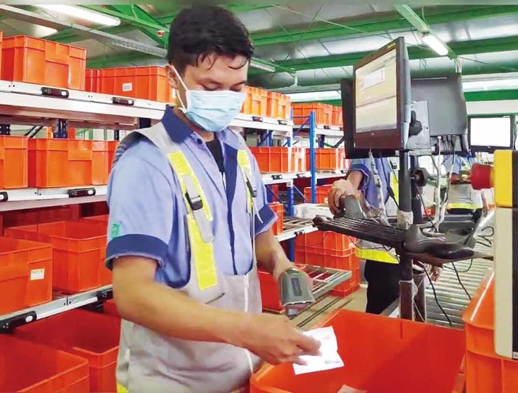 An operator performing the batch picking operation at the Goods-to-person picking station. There are 4 stations and each station is capable of handling 2,000 orders per day. A put-to-light system is located on his back.