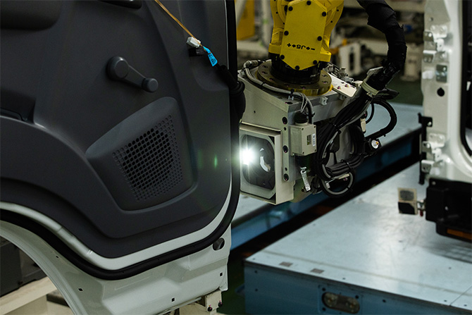 Ueki: The difference is huge. A robot arm is inserted on the inner side of the door to tighten the bolts when mounting, but reducing the opening angle to 70 degrees decreases the range in which the arm can move. We needed a system capable of performing the mounting work safely and properly, because we cannot ship a vehicle if a door or the body ends up damaged due to working in that narrow space.