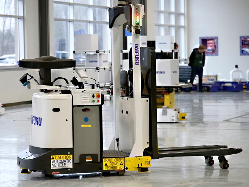 Various types of AGVs are on display, including automated forklifts.