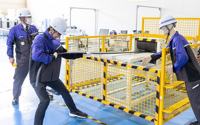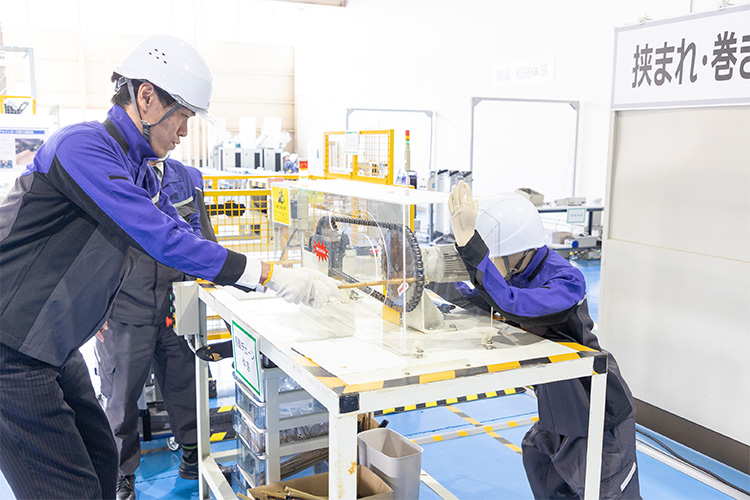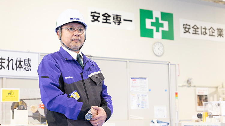 In addition to classroom-based education on general safety for employees and site management for supervisors, the Daifuku Group provides practical training at the Safety Simulation Center, where participants can experience hazards rather than just learn about them. “Our goal is to teach participants through practical experience so that they can work with safety in mind,” says Safety Education Center director Koji Fukuda.