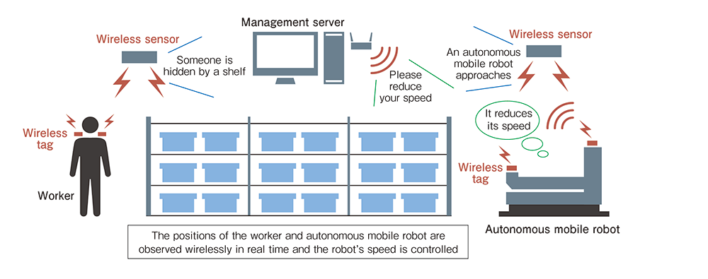 One cause of accidents is the energy gap between human beings and machines. If they happen to come into physical contact, it will be the human, who has less energy, that will fare badly. To prevent that happening, the basic measures up until now have been "safety distances" where the operating areas of people and machines are kept separate, and "safety stoppages" where machinery is stopped when someone enters its operating area. Collaborative safety utilizing ICT is essential if autonomous mobile robots and people are to work in the same operating area.