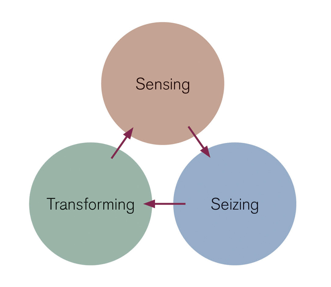 The important thing is to innovate by reorganizing existing resources rather than starting from scratch. This sequence is generated by dynamic capability, which is itself made up of three capabilities: detecting environmental change (sensing), grasping opportunities (seizing), and reorganizing resources and changing (transforming). (Fig. 1)