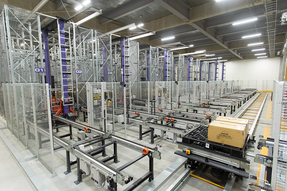 課題であった在庫商品の保管には、ダイフクが新たに開発した超高密度パレット自動倉庫「シャトルラックD3(ディースリー)」※を導入しています。このシステムはラックの奥行き方向に複数パレットを保管する構造で、入出庫に必要な搬送用のスペースを減らし、保管用のスペースを拡張することで超高密度で保管を実現します。センターではすべての商品は7階から入庫します。パレット単位で保管する商品は7階の入庫コンベヤに投入すると、高速搬送台車「STV」などを経由して、7階(3アイル、2,793棚)もしくは8階(4アイル、4,593棚)のシャトルラックD3まで自動で搬送、保管されます。SSV商品は販売計画に基づき、シャトルラックD3から出庫され、6階のパレット自動倉庫「コンパクトシステム」(741棚)で一時保管します。また、ケース単位で保管する商品も7階の入庫コンベヤに投入すると、6階のケース自動倉庫まで自動搬送されます。各階をコンベヤや垂直搬送機でつなぐことで、どの階に商品を在庫していても意識することなく出荷作業が行えるようなレイアウトにしています。