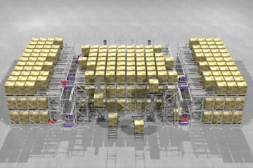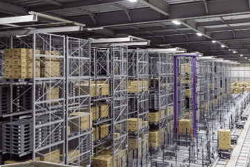 商品在庫を保管するケース自動倉庫(左)と、ピッキングが完了していないコンテナを一時保管するシャトルラックM(右)。