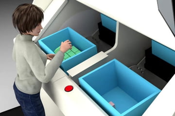 GTP:Goods To Personの略で、定位置ピッキングのこと。在庫コンテナと集品コンテナが作業者のもとに自動で供給される。カートピッキングに比べて、商品を探して歩き回る必要がないため、作業効率が向上し、作業者の身体的負担も緩和できる。