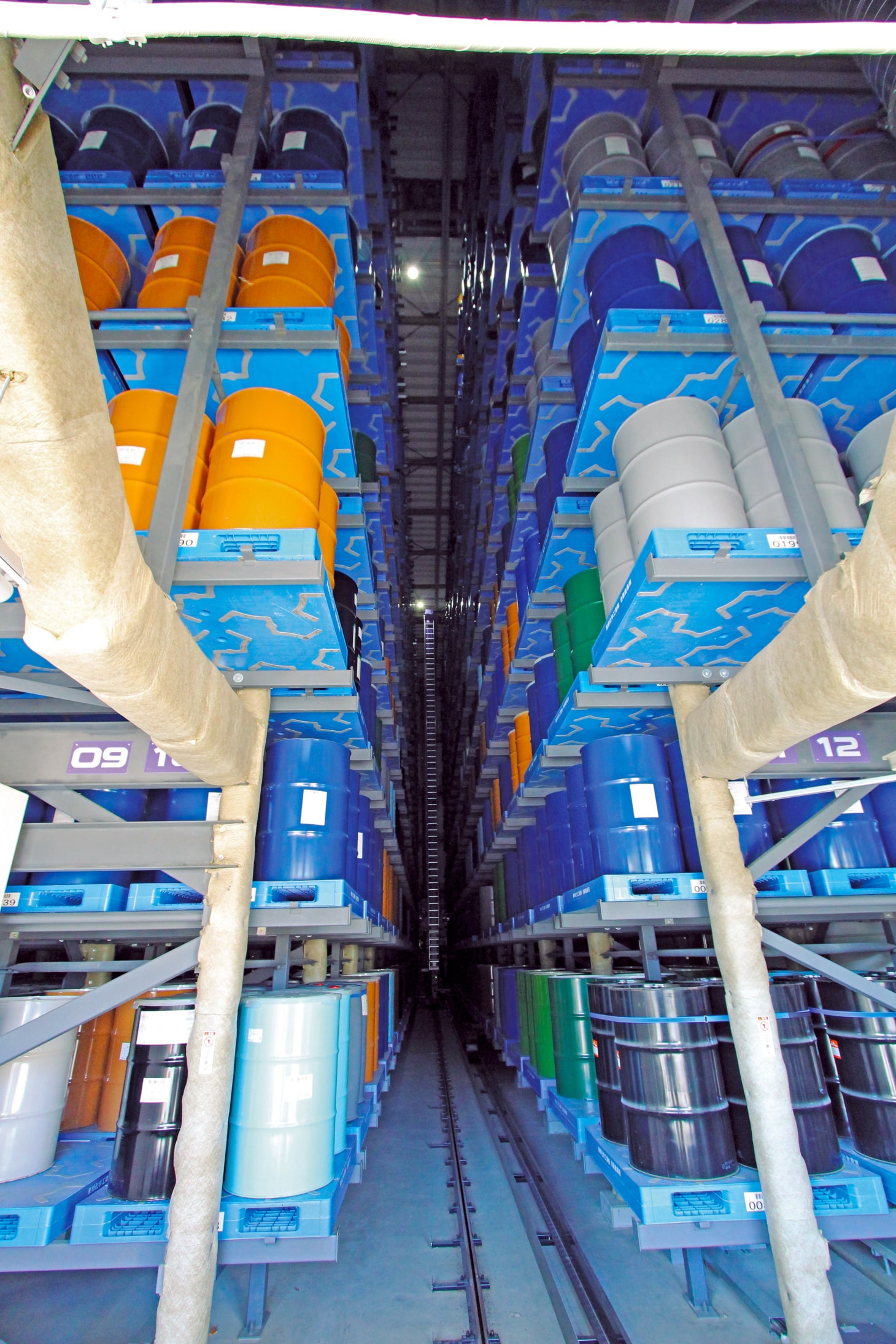 危険物自動倉庫は、消防法により建物面積1,000m2以下、高さ20m 未満と定められています。そこで、棚の奥行き方向に2つまで格納できるダブルディープ方式を採用し、高密度保管を実現しました。もちろんスタッカークレーンの給電装置などは火花を発生させない防爆仕様で、倉庫内には消火設備としてCO2ボンベ室も配備しています。