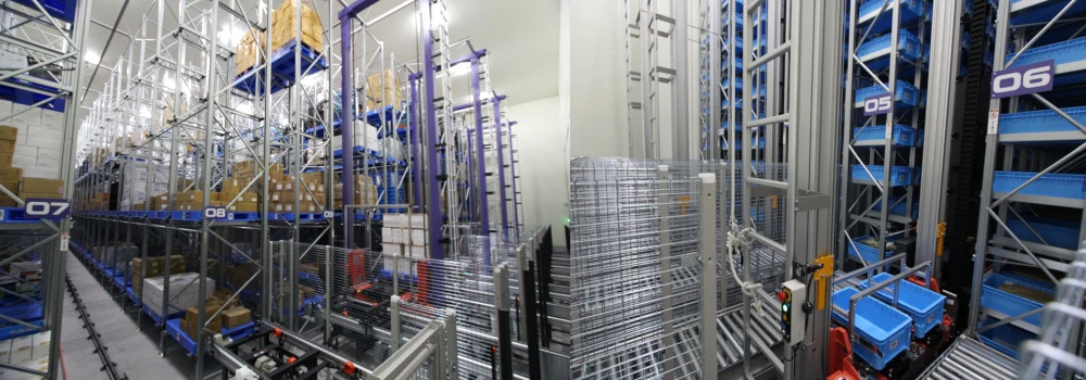 コンテナやケース単位の小物保管に最適な高速小型立体自動倉庫。電子部品や日用雑貨品の保管にも最適。
