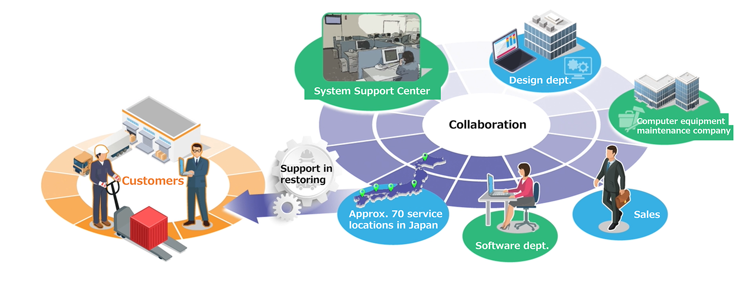 At the System Support Center, technicians with expertise in material handling equipment are always on standby to support the stable operation of customer systems through coordination with approximately 70 service locations and departments across Japan.